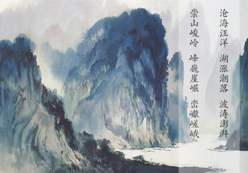 再如“沧海汪洋,湖涨潮落,波涛澎湃;崇山峻岭,峰巍崖崛,峦巘嵯峨。”这是一副描写山水的同旁联。上联也是用的“三点水”旁,下联用的是“山”字旁,有山有水,而山高水阔,各有姿态。