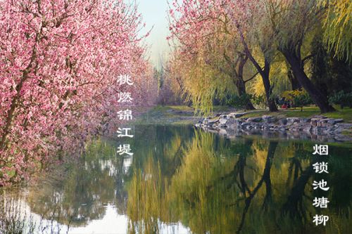 不过,历来更为人称道的对句,则是“桃燃锦江堤”。显然从意境上来说,与“烟锁池塘柳”更为契合,而五行也包含其中。