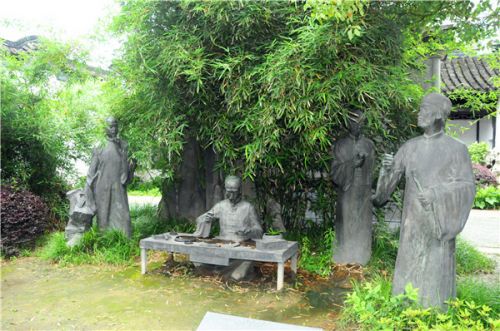 走进这间不大的院落,转过青砖绿瓦的影壁,在翠竹绿柳的掩映下,四尊人物雕像或盘坐挥毫、或拈须思索、或专注诗书、或击节吟唱。这四人正是人称“四王”(清初画坛的著名绘画流派)的王时敏、王鉴、王翚、王原祁。
